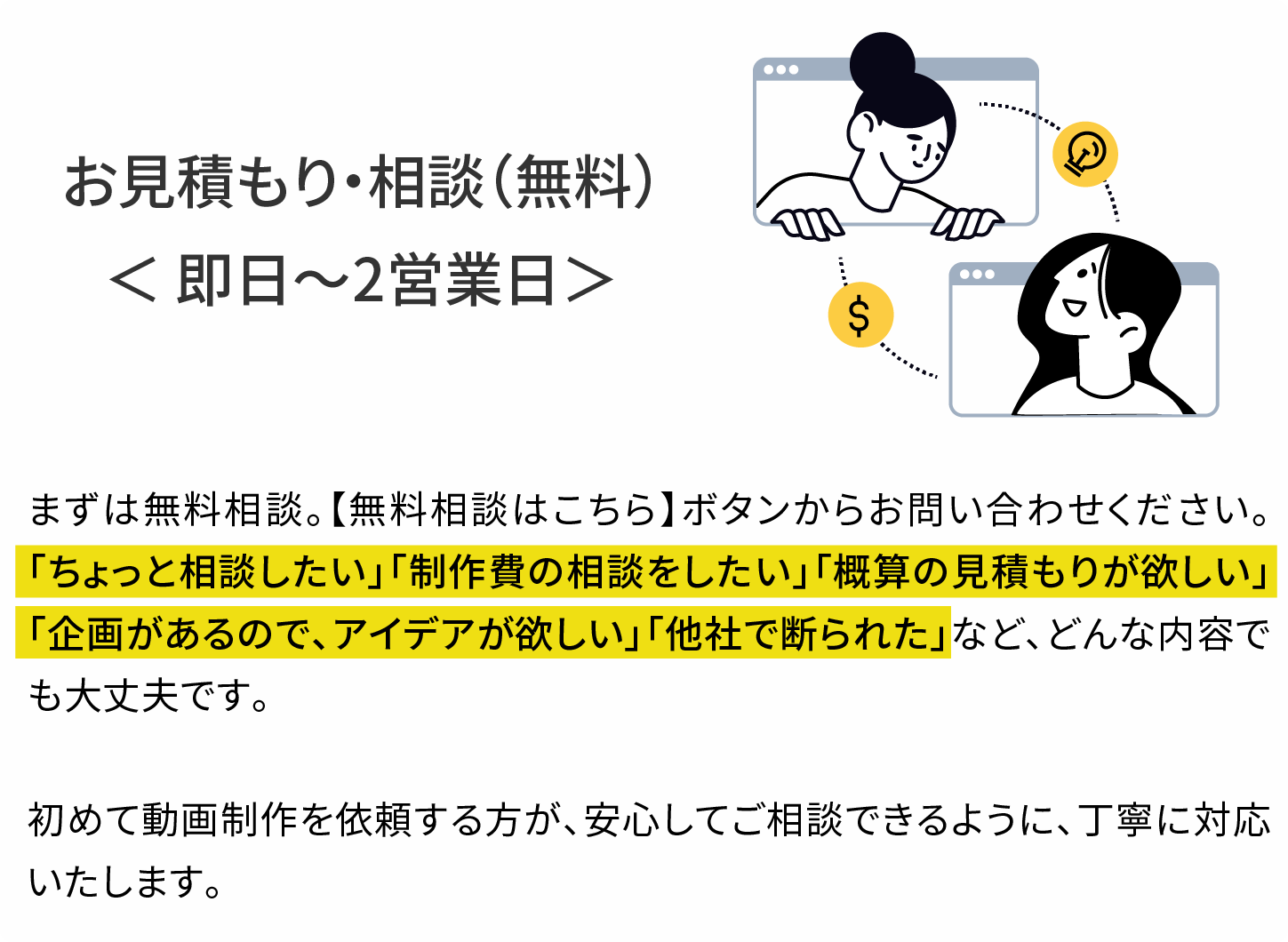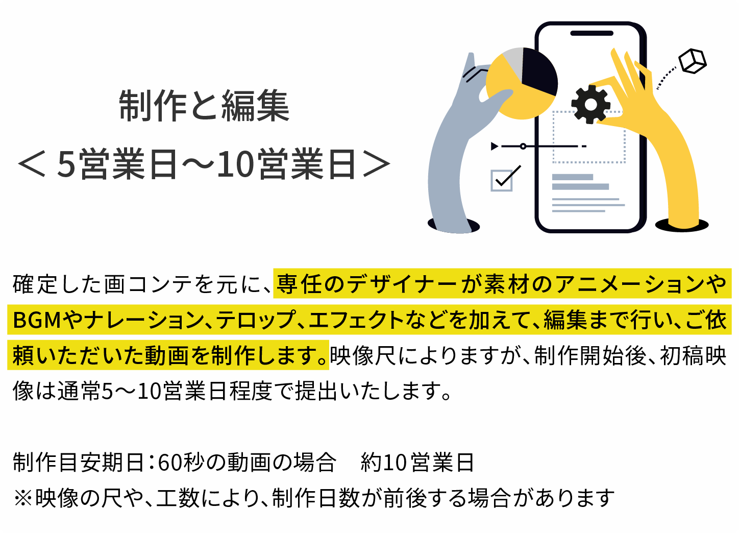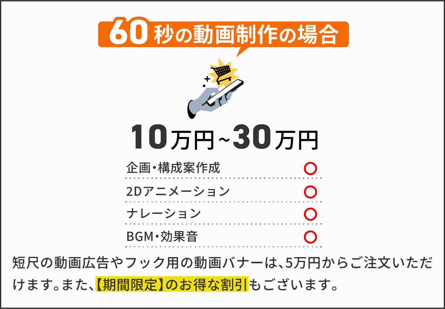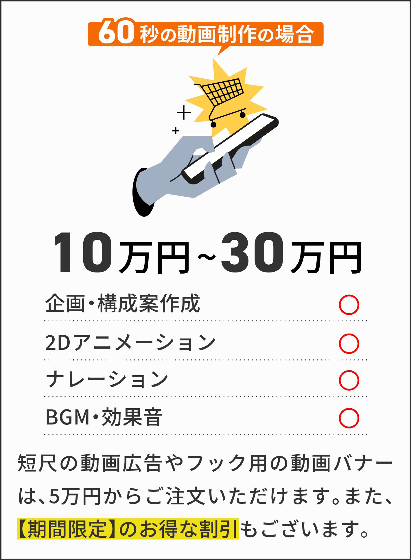 通常、動画制作はチームで制作や、外注で制作をするため、人件費のコストが高額になります。当サービスは、企画から素材のデザイン、制作まで全て一人で行うため、人件費を抑える事ができ、業界相場より、お得な料金で制作が可能です。