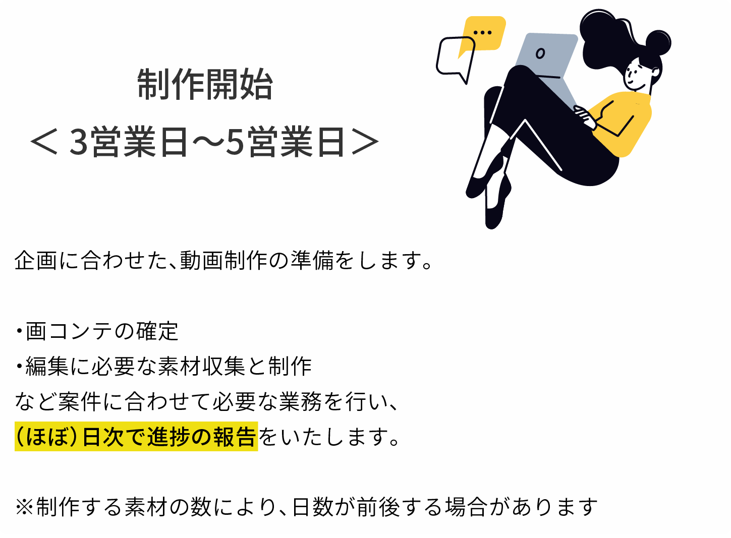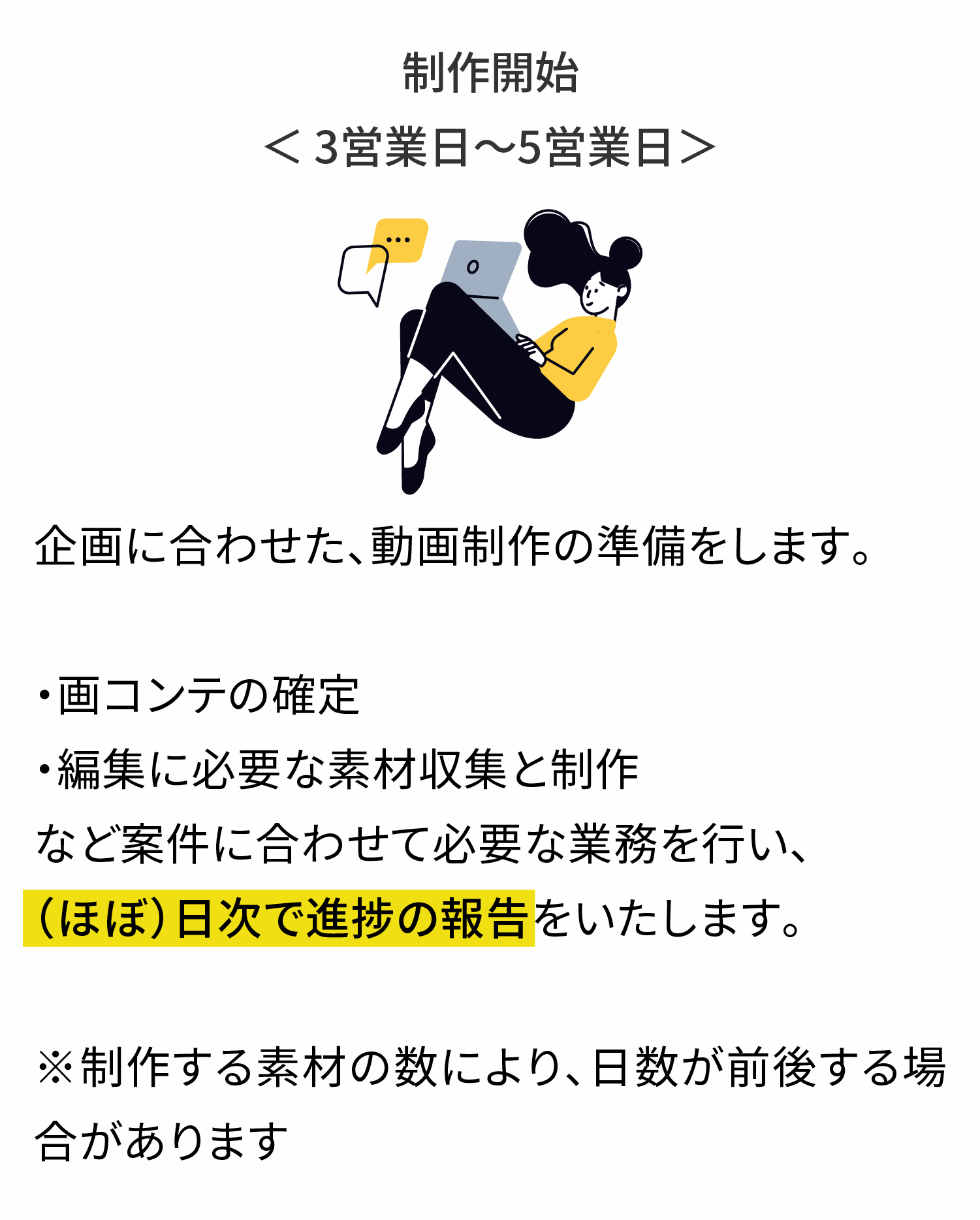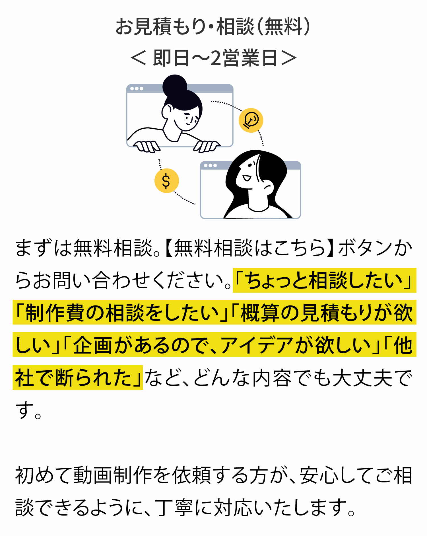 通常、動画制作はチームで制作や、外注で制作をするため、人件費のコストが高額になります。当サービスは、企画から素材のデザイン、制作まで全て一人で行うため、人件費を抑える事ができ、業界相場より、お得な料金で制作が可能です。