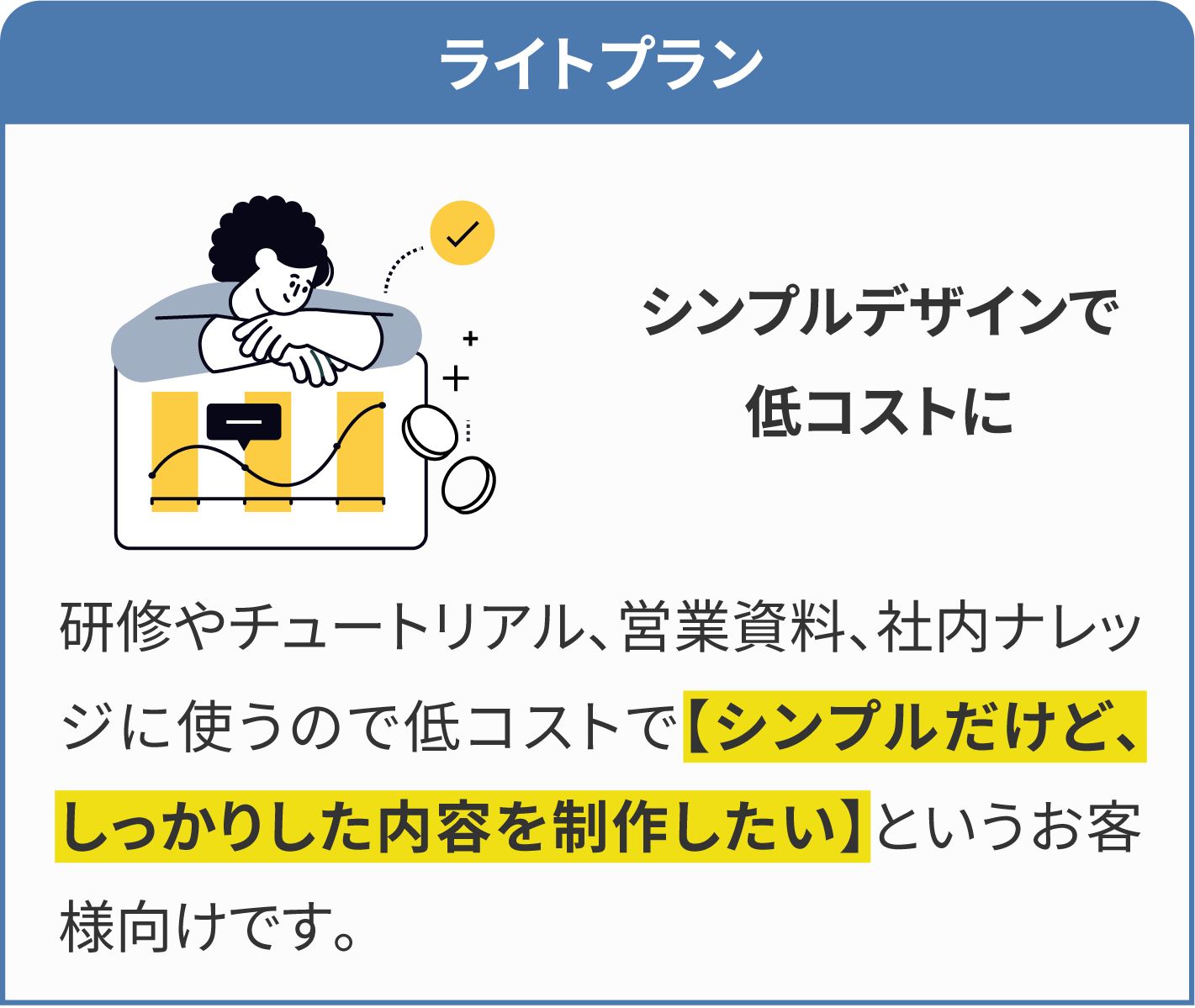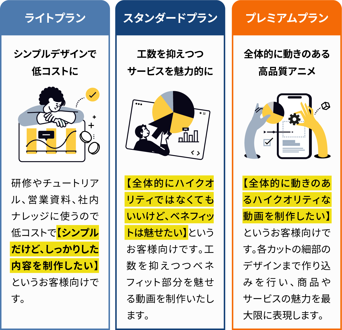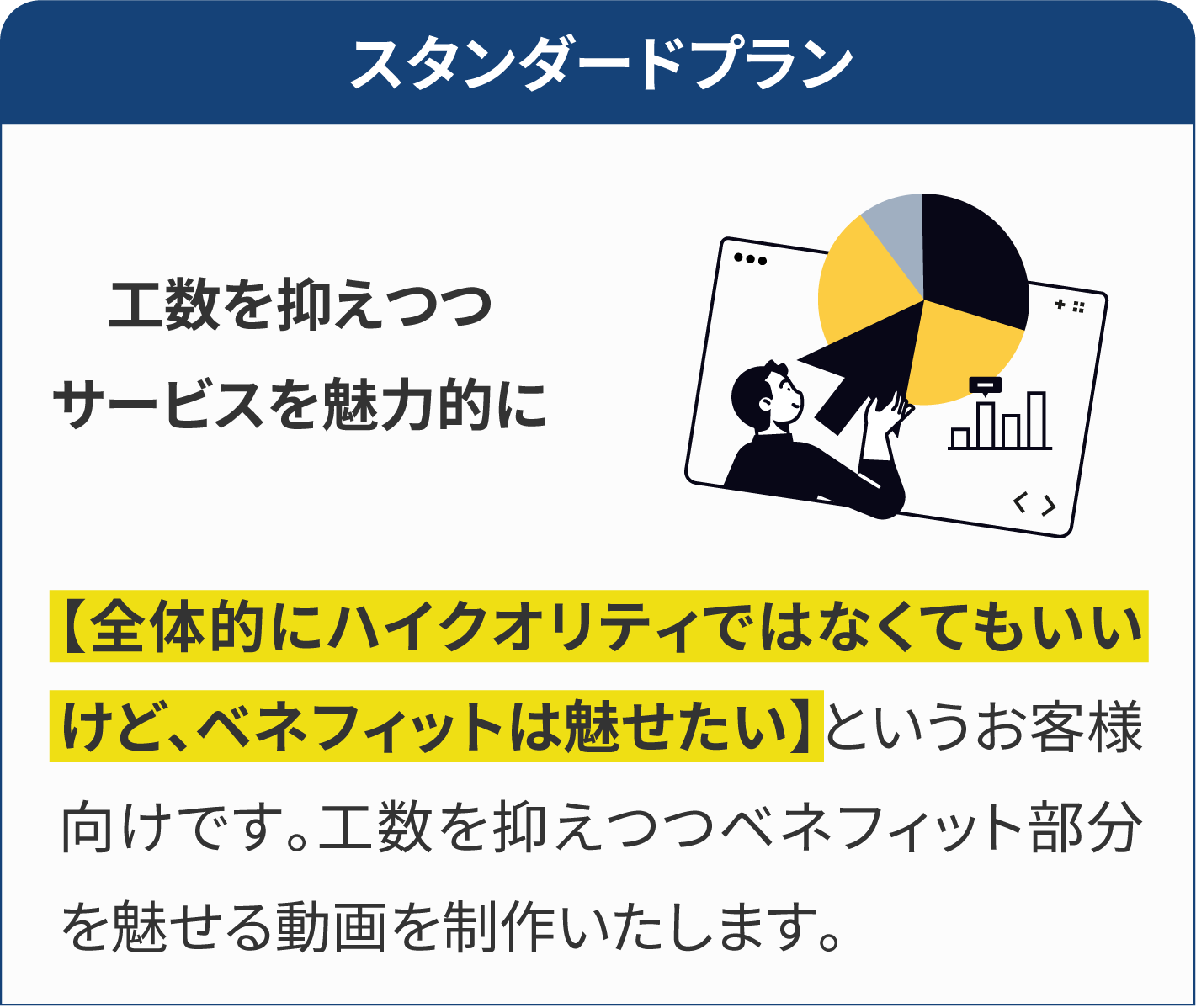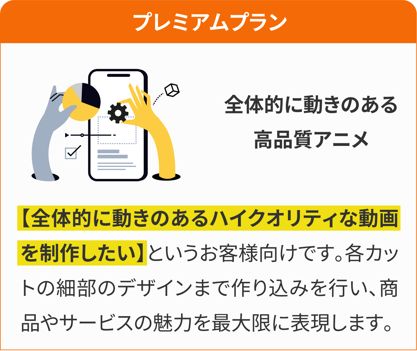 通常、動画制作はチームで制作や、外注で制作をするため、人件費のコストが高額になります。当サービスは、企画から素材のデザイン、制作まで全て一人で行うため、人件費を抑える事ができ、業界相場より、お得な料金で制作が可能です。