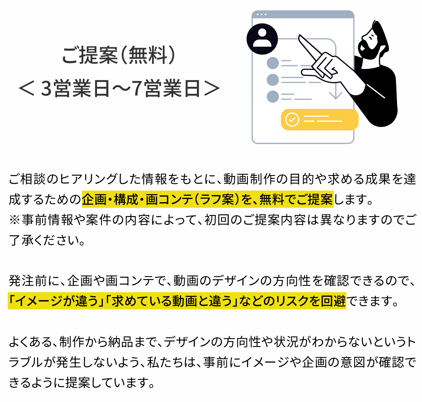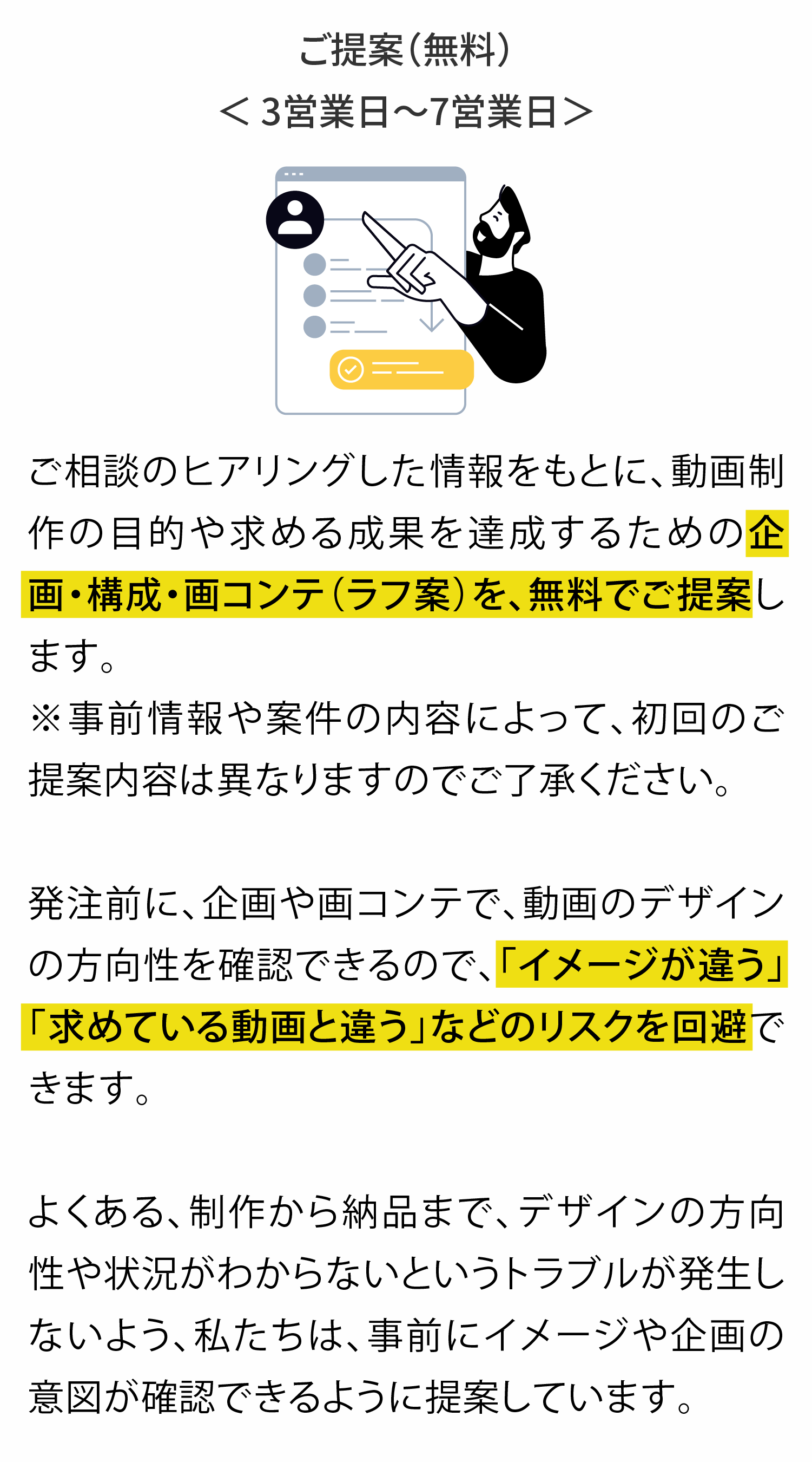 制作工程の節目に、クライアントチェックをお願いしながら、制作を行いますが、チェック後に、下記のような大幅な修正がある場合、追加料金が発生します。